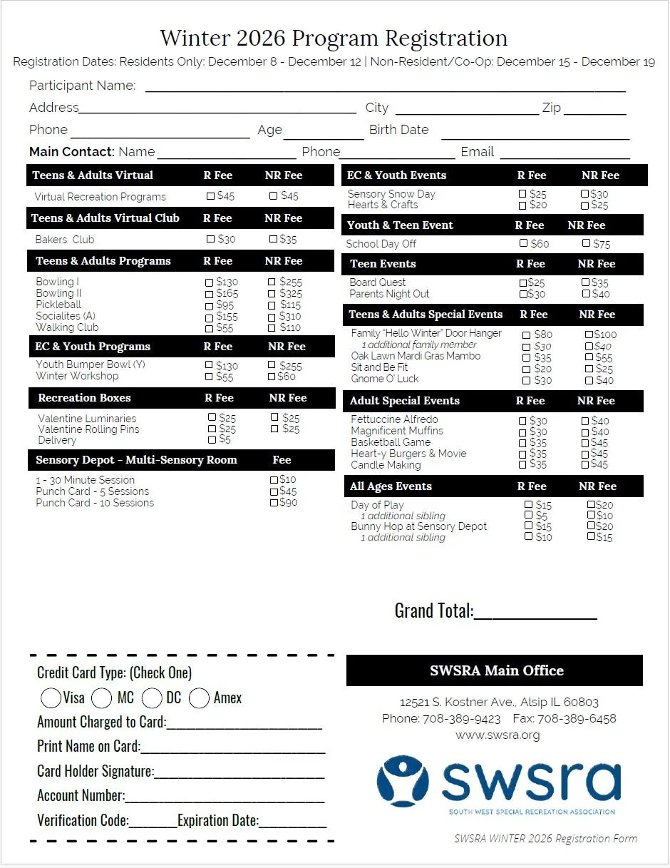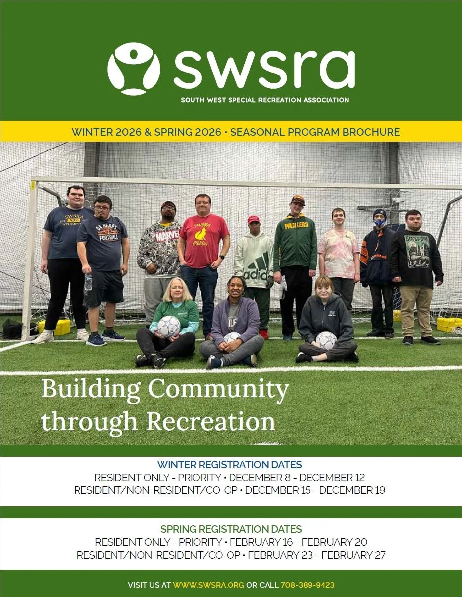 SWSRA relies upon the post office for mail deliveries of our seasonal brochures. SWSRA assumes no responsibility for mail delivery. If for some reason you do not receive a brochure, please pick one up at your park district, recreation department, or the SWSRA office.INCLUSION